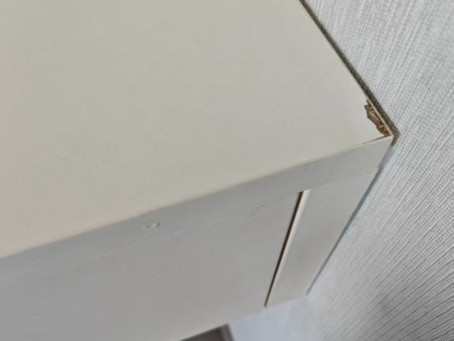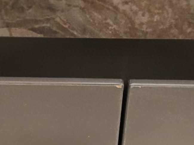 周女士进一步仔细检查已安装的部分柜体,还发现了更多细节问题。“封边处有明显黑线,板面存在多处磕碰伤痕,部分拼接位置也对不齐。”周女士表示,当初选择“简一”是出于对品牌的信任,如今对这样的质量感到难以接受。“正常情况下,简一的板子出厂都应该带有保护膜,但这批板子全都没有,表面还留有手印和污渍,不知道用的是不是淘汰下来的板材。”周女士说。