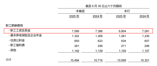 据半年报披露,光大银行的职工薪酬费用构成包括职工工资及奖金、基本养老保险及企业年金、住房公积金、职工福利费、其他。单就职工工资及奖金来看,该行2025年上半年的该项费用为68.04亿元,较2024年同期的70.91亿元减少2.87亿元,降幅为4.05%。据此计算,该行2025年上半年的人均工资及奖金为14.32万元,较2024年同期的15.09万元减少0.77万元,降幅为5.11%。