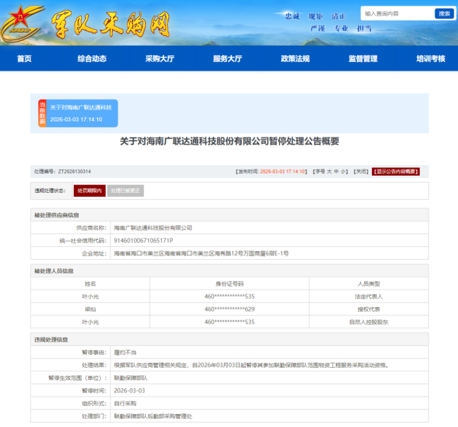3月3日,军队采购网发布《关于对海南广联达通科技股份有限公司暂停处理公告》(处理编号:ZT2026130314)。