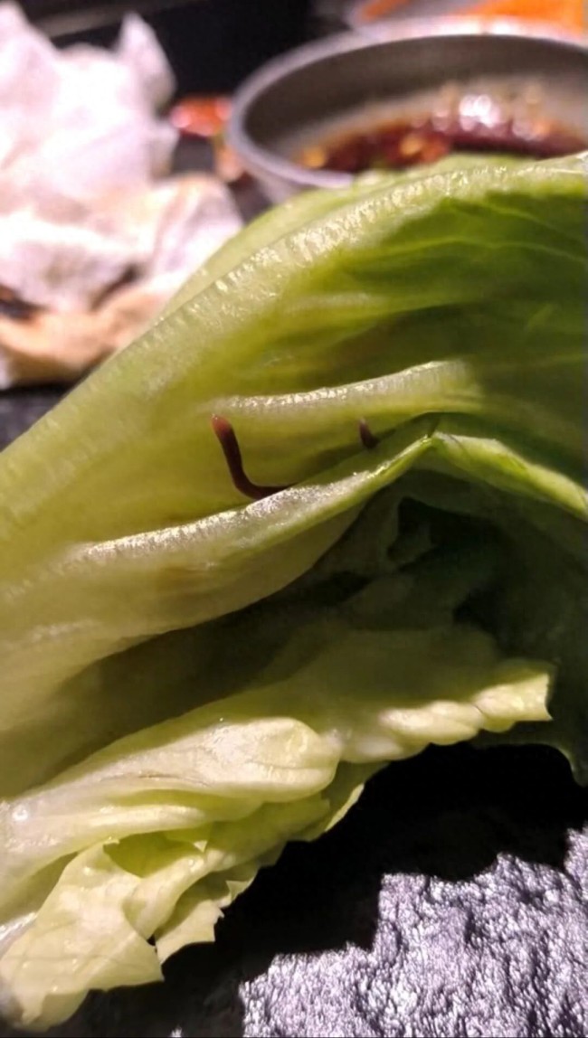 此前,赵先生想带孩子去济南西部经十路旁一家刚开业不久的大型商场就餐,提前通过软件预约了其中的核桃碳烤肉馆双人套餐。3月15日中午,赵先生带孩子来到这家餐厅吃午饭,当用餐即将结束,准备拿生菜叶包肉的时候,他突然看到菜叶上有一条约3厘米长的虫子正在蠕动。“我当时就感到很恶心,直接喊来了工作人员。工作人员在那里愣半天,一直说不好意思,问我要不要换一盘菜,我说我现在也没有胃口了。”由于当天店长不在,赵先生并没有为难工作人员,而是随后联系了订餐平台,希望平台方能依照食品安全法规定与商家沟通出一个理赔方案。“我就直接带着孩子走了,因为孩子还要再去别的地方玩。”