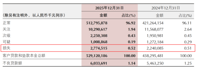 值得注意的是,重庆银行的损失类贷款大幅增加。截至2025年末,该行损失类贷款余额为27.75亿元,较2024年末的22.40亿元增加5.35亿元,增幅为23.88%。