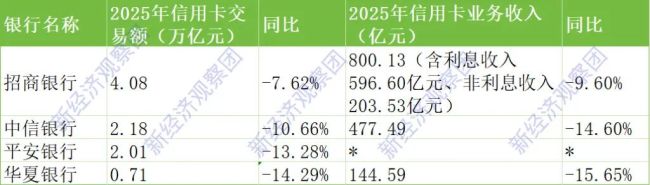 业务收入方面,招行2025年信用卡业务总收入(以利息收入和非利息收入之和计算)800.13亿元,2024年同期为885.08亿元,同比下滑9.60%;中信银行和华夏银行信用卡业务收入均下滑超10%,