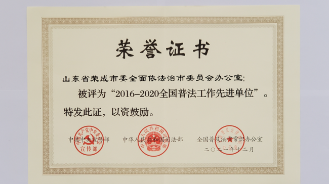 中共荣成市委全面依法治市委员会办公室荣获全国“七五”普法工作先进单位荣誉称号。
