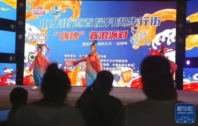 8月8日,市民在青岛莱西市月湖步行街观看表演