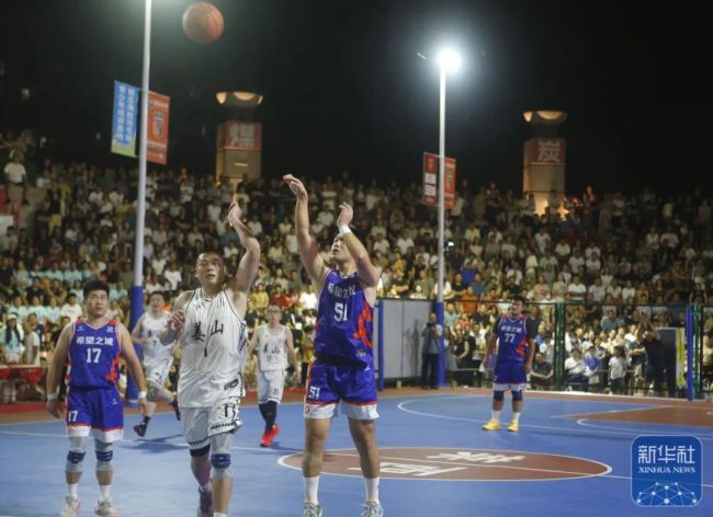 8月8日在青岛莱西市人民广场拍摄的莱西市篮球联赛现场