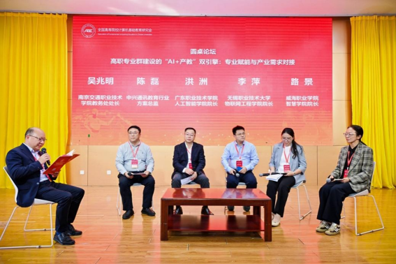 两场圆桌论坛聚焦高职专业群建设核心议题。江苏食品药品职业技术学院党委副书记安进主持“高职专业群建设的‘AI+产教’双引擎:专业赋能与产业需求对接”论坛,南京交通职业技术学院教务处处长吴兆明、中兴通讯教育行业总监陈磊、广东职业技术学院人工智能学院院长洪洲、无锡职业技术大学物联网工程学院院长李萍、威海职业学院智慧学院院长路景等5位嘉宾,围绕专业群与产业需求对接、数字化资源共建等展开讨论,提出“AI+专业”赋能的创新思路。