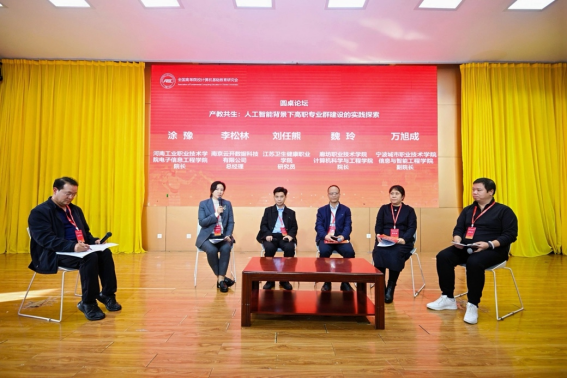 两场圆桌论坛聚焦高职专业群建设核心议题。江苏食品药品职业技术学院党委副书记安进主持“高职专业群建设的‘AI+产教’双引擎:专业赋能与产业需求对接”论坛,南京交通职业技术学院教务处处长吴兆明、中兴通讯教育行业总监陈磊、广东职业技术学院人工智能学院院长洪洲、无锡职业技术大学物联网工程学院院长李萍、威海职业学院智慧学院院长路景等5位嘉宾,围绕专业群与产业需求对接、数字化资源共建等展开讨论,提出“AI+专业”赋能的创新思路。