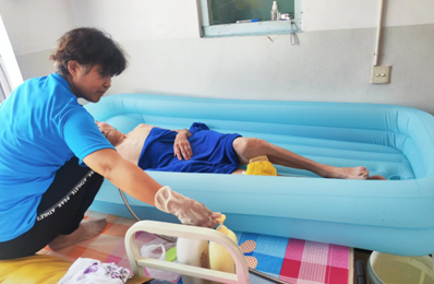 80岁的于志伟老人因小儿麻痹症导致下肢功能损伤,五年前又因白内障视力急剧下降,生活陷入困境。区民政局联系助浴团队上门为他提供充气床浴缸服务,能使全身浸在水中舒适沐浴,于大爷也久违的笑了出来。