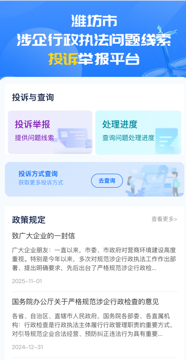潍坊市涉企行政执法问题线索投诉举报平台还特别设立“政策发布”功能,将最新、最准确的行政执法政策规定、裁量基准以及合规要求,直接推送给企业。帮助企业快速了解自身的权利与义务,明确执法边界,从源头上提升企业合规经营能力,让企业在发展中少走“弯路”,为营商环境优化注入更多活力。