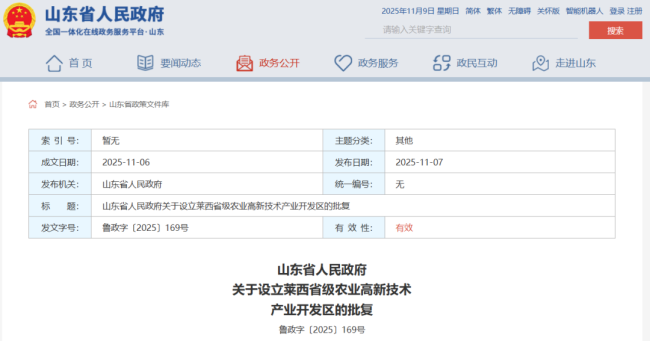 11月7日,山东省人民政府网站发布关于设立青岛莱西省级农业高新技术产业开发区的批复。