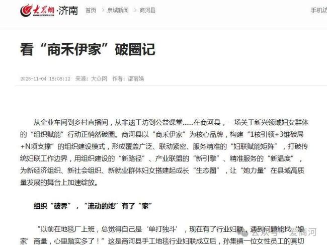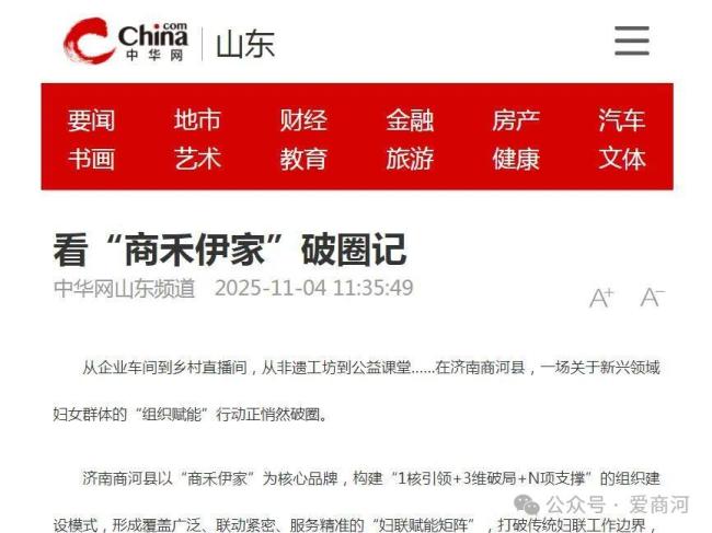 近日,《中国妇女网》刊发文章《山东商河构建“1核引领+3维破局+N项支撑”组织建设模式“商禾伊家”为新兴领域妇女搭建成长“生态圈”》宣传推广济南市商河县“商禾伊家”新兴领域妇联组织建设工作做法,中华网、大众网、齐鲁壹点、济南改革等多家媒体同步报道推广。