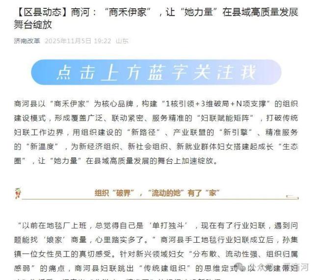 在山东省济南市商河县,一场关于新兴领域妇女群体的“组织赋能”行动正悄然破圈——从企业车间到乡村直播间,从非遗工坊到公益课堂,商河县妇联以“商禾伊家”为核心品牌,构建“1核引领+3维破局+N项支撑”的组织建设模式,形成了覆盖广泛、联动紧密、服务精准的“妇联赋能矩阵”,打破传统妇联工作边界,用组织建设的“新路径”、产业联盟的“新引擎”、精准服务的“新温度”,为新经济组织、新社会组织、新就业群体妇女搭建起成长“生态圈”,让“她力量”在县域高质量发展的舞台上加速绽放。