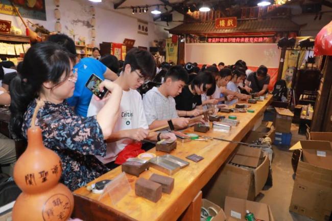“‘遗’脉相承,威海非遗点亮计划”项目,将非遗体验活动设在省级非遗旅游体验基地吉呈轩,打造了市民、游客点赞的“沉浸式非遗体验课堂”。作为威海非遗项目的实践地,吉呈轩本身就是一座小型“活态非遗博物馆”,传统锔艺、剪纸、锡镶、手钩织、锻铜、木板年画等非遗展品应有尽有,参与者在这个充满文化气息的空间里学习铜版画、了解皮影戏,不仅是沉浸式体验技艺,更是与历史对话。“文化空间本身就是最好的老师。”在项目负责人耿海胜看来,这里的每一件老物件都是会讲故事的老师,人们一走进来,心就静了,专注感受传统技艺。