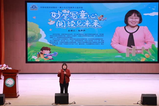 仪式上发布了活动通知及推荐书目,公布了淄博市阅读推广人名单,并通过《梅花颂》《星辰照古今》等环节,引领读者在书香中沉淀思想、涵养精神,感受阅读跨越时空的独特魅力。随后,中国作家协会会员、著名儿童文学作家毛芦芦带来题为《妙笔写童心,阅读见未来》的主题讲座。同期开展的“护苗・绿书签”版权保护宣传活动,以“汇聚你我力量,共护健康成长”为主题,进一步增强了读者的版权保护意识。