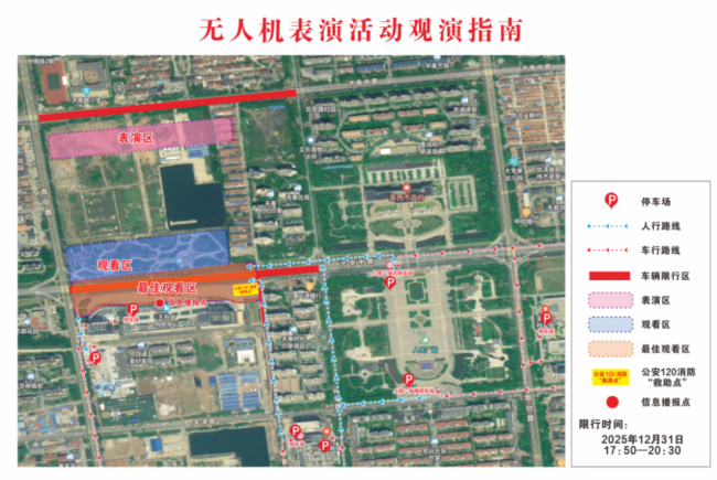 为保障公众有序观演,活动现场划定了明确观看区域:东至厦门路,西至青岛路,北至城市公园,南至王府井商场。主办方已协调行政审批中心、群众文化中心等场所开放停车位,最大限度满足公众观演需求。