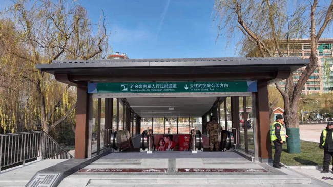 新建成的通道全长约64米,行人可2分钟左右安全过街。设计上充分融入“一湖一环”景观体系,与环城公园慢行系统有机衔接。出入口分别位于泉城广场西北侧绿化带及趵突泉公园东门北侧广场,均配备自动扶梯、步行楼梯与无障碍电梯,兼顾通行效率与人文关怀。