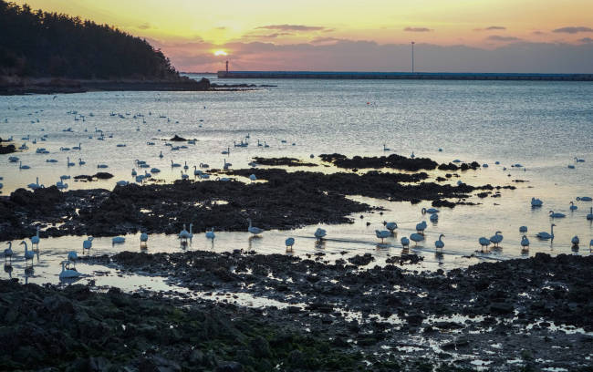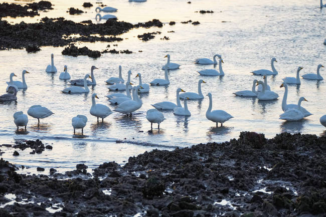 1月5日,大天鹅在荣成市俚岛镇沿海水域栖息。