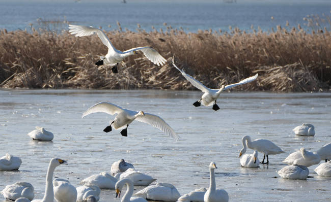 1月5日,大天鹅在荣成大天鹅国家级自然保护区飞翔。