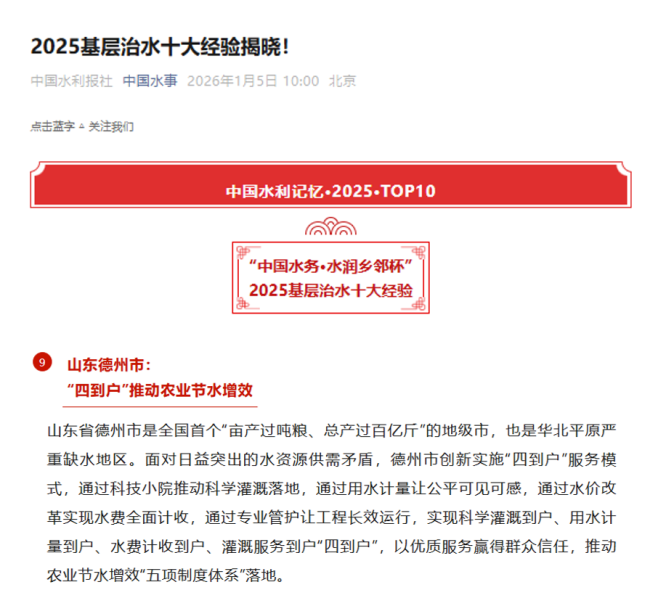 近日,第十五届年度“中国水利记忆·TOP10”评选结果揭晓,德州市“四到户”推动农业节水增效做法成功入选“中国水务·水润乡邻杯”2025基层治水十大经验。