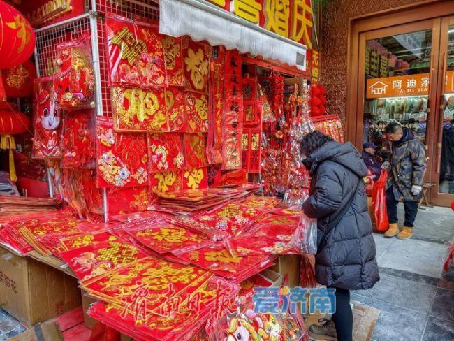 1月21日,在济南经一路一家小商品批发市场入口,挂满了鲜艳的春联、醒目的“福”字和各式灯笼,洋溢着浓厚的节日气氛。剪纸造型的马年窗花、印有骏马图案的红包、小巧可爱的马形挂饰,以及经典的中国结等节庆饰品琳琅满目,既有传统韵味,又不乏简约现代的设计,吸引了不少市民前来挑选。