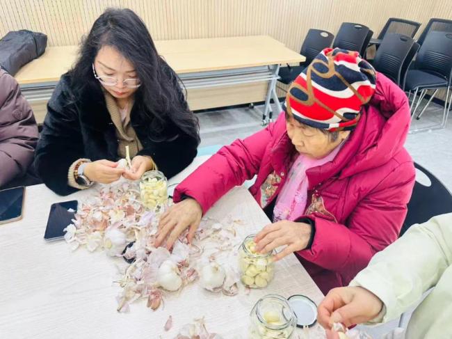 华润社区活动室内醋香扑鼻、笑语阵阵,居民们一边腌制腊八蒜,一边分享家常与腌制秘诀。社区还将热粥与新腌的腊八蒜送至快递、外卖站点,让忙碌的新就业群体也能感受到“家”的温暖与节日的仪式感。