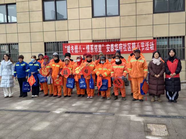 1月26日上午,张家洼街道安泰华府社区开展“暖冬腊八·情系邻里”主题活动,邀请辖区环卫工人走进社区,围坐一堂共品香甜腊八粥。社区工作人员还为环卫工人们送上福字、保暖手套等贴心物资,叮嘱大家注意防寒保暖,让关怀与温暖直达人心。