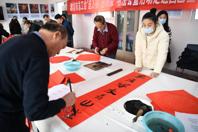 潍坊全市各级工会同步启动该活动,分别组织书法爱好者进企业、社区、商户、学校广泛开展“送万福进万家”书法公益活动……通过将书法艺术与新春民俗相结合,既丰富了职工的精神文化生活,又营造了喜庆祥和、崇德向善的节日氛围。截至目前,全市各级工会现场书写并送出春联“福”字上万副。
