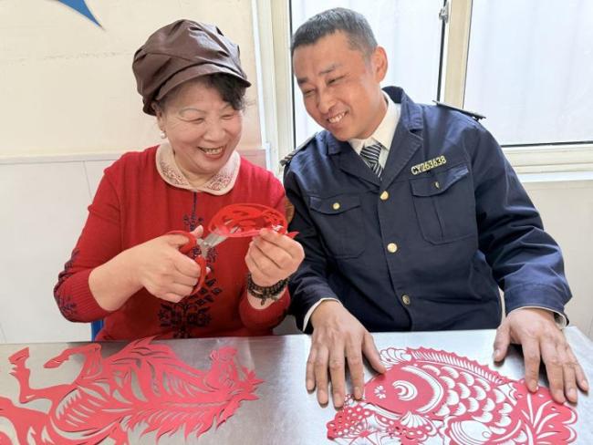 另一边,红色宣纸、剪刀等物品整齐摆放,其他社区居民和江继岳从“折”到“剪”,不一会儿,栩栩如生的“福”字、可爱的生肖图案便纷纷呈现。居民张女士告诉记者,“我的孩子们在外地还没回来,今天能和大家热热闹闹的一起包饺子、剪窗花,感觉特别开心!”