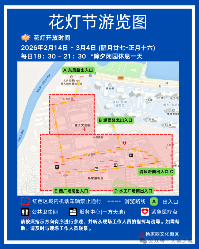 二、倡导绿色出行,提前规划路线,错峰游园。请自觉文明观赏、有序游览,共赏运河璀璨华灯,同度平安祥和新春。