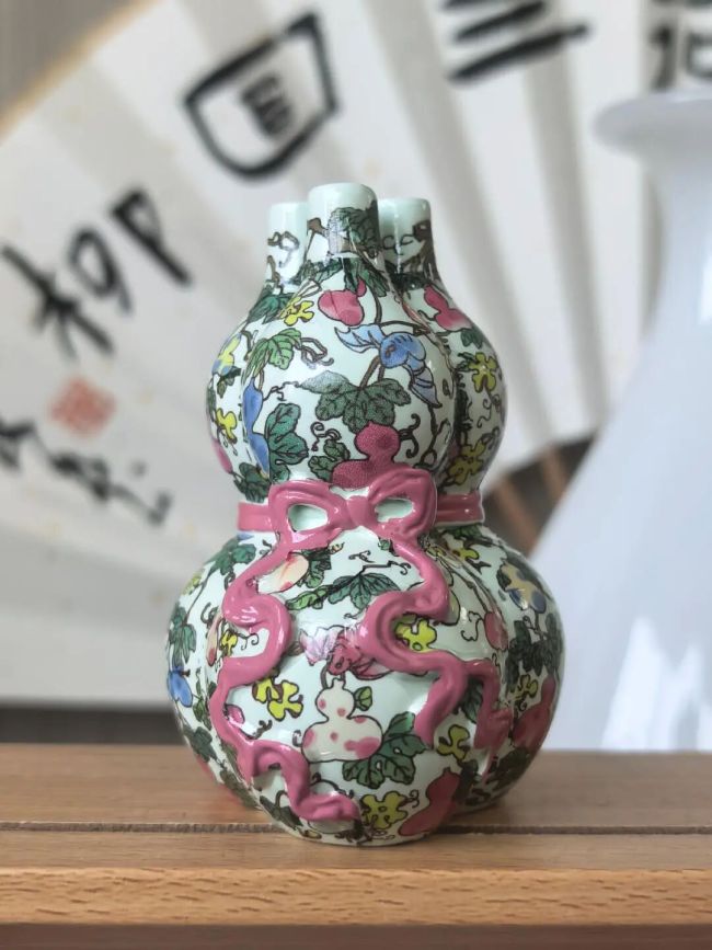 葫芦谐音“福禄”,三孔相连,则意喻福气通天、洪福齐天。这件微缩复刻的冰箱贴,原型为馆藏清代粉彩三孔葫芦瓶。瓶身的缠枝纹、吉祥彩绘被真实还原,方寸之间,尽是清代匠人对生活的热望。把它请回家,哪怕只是开冰箱拿菜的一瞬,也像在一日三餐里接住了一份旧时福气。