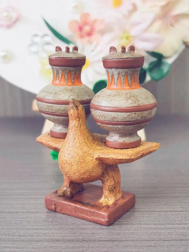 这件文创的原型,是济南无影山汉墓出土的镇馆之宝——西汉彩绘负壶陶鸠。在古代,鸠鸟是“不噎之鸟”。《后汉书》载:“鸠,不噎之鸟也,欲老人不噎。”它承载着汉代人对长者食道通达、健康长寿的朴素祈愿。