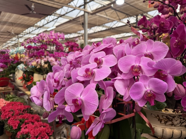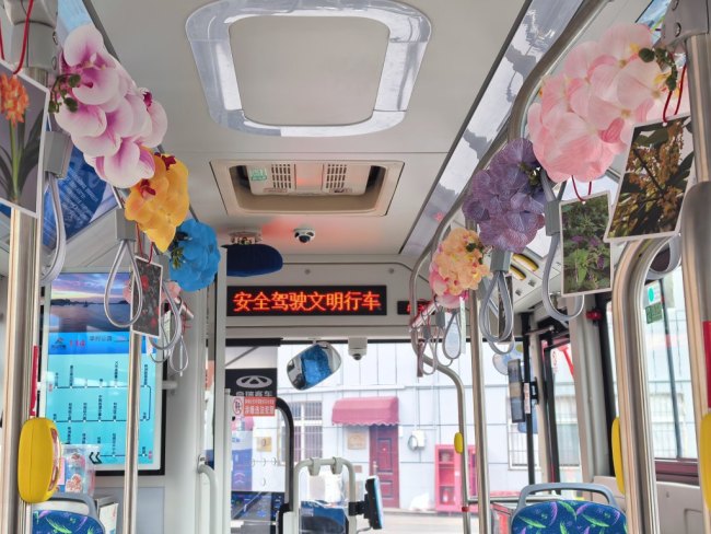 其中,直达枯桃花卉交易中心的114路公交车化身“迷你花市”。该线路无缝衔接枯桃地铁站,下车后仅需步行281米即可抵达花市。步入车厢,马年主题的红色窗花与福字映入眼帘,扶手处缠绕的仿真蝴蝶兰与花市主打花卉相映成趣,瞬间将乘客带入一个穿梭于城市中的微型花海。除了视觉上的年味与花意,车厢内还有手绘出行指引、花语海报,让乘客、既能规划行程,又能领略花卉文化。