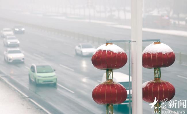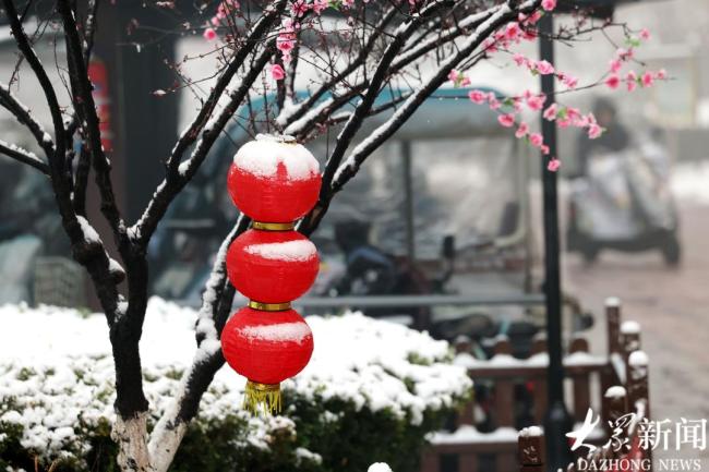市迎来一场较大降雪。3月2日,济南市区银装素裹,春雪映衬欢庆佳节的红灯笼,在雾中显得十分醒目。