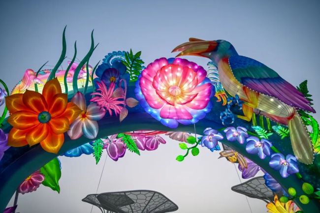 以各类鹦鹉和繁茂的热带植物为设计灵感,高饱和的鲜明色彩碰撞蜿蜒灵动的有机线条,把赤道雨林的鲜活与炽热,凝练在一组组花灯之中。