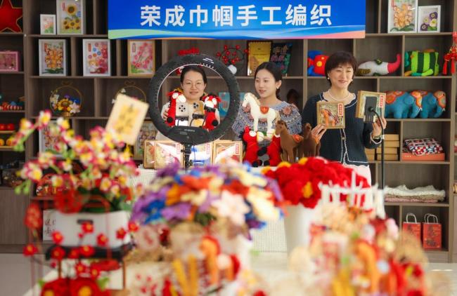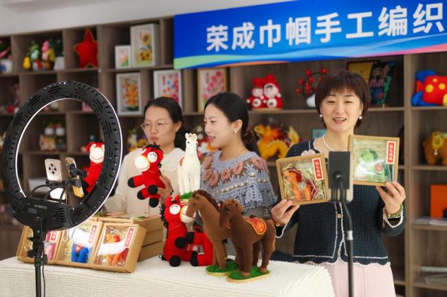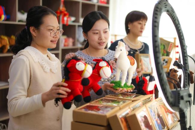3月4日,在威海荣成市妇联巾帼创业孵化基地,女性创业者通过电商平台在销售各种钩针编织马摆件。