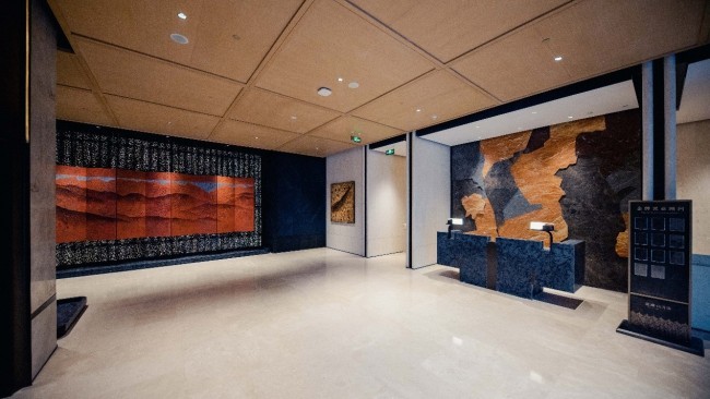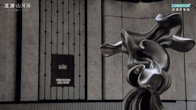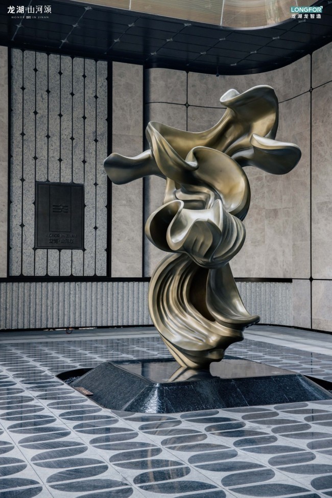 最让人眼前一亮的就是价值百万的艺术雕塑。「泱颂」雕塑位于归家大堂中央,灵感来自中国传统山水画中的“山河图”。整个雕塑采用钛合金不锈钢铸造而成,整体尺寸为3.7*2.5*4.6m,与约9m挑高穹顶相映成趣,营造鼎级豪门归家的仪式感。