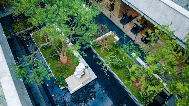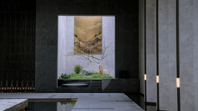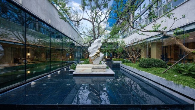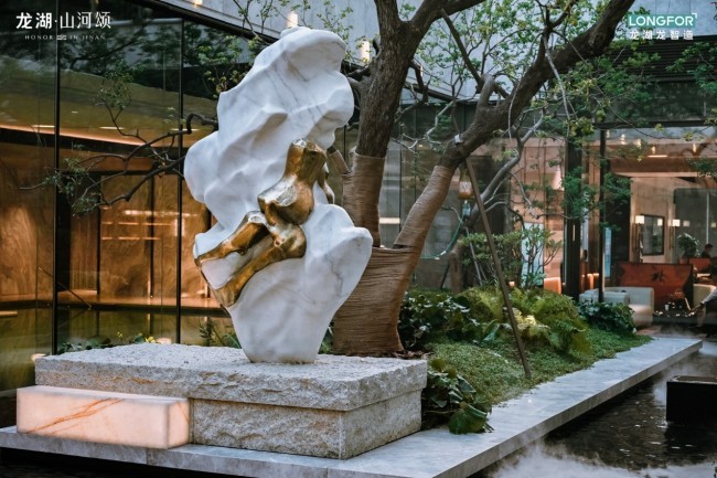 本次实景示范区亮相的就是南城首个会所中庭下沉庭院——琉璃水院。漫步其中,目之所及皆是全球奢材,如局部镶嵌的潘多拉奢石,居中打造的汉白玉雕塑「岱晖」,以及跋山涉水寻来的特选名木乌桕和红枫……传递出大美无言的显赫奢宅品格。它们会在琉璃水院里,继续与你一起见证属于山河颂的美好生活。