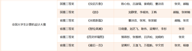 中国大学生计算机设计大赛是计算机与设计学科交叉融合的重要平台,该赛事涵盖人工智能、数字媒体设计等前沿方向,强调技术与多学科的交叉创新。文化传播学院数媒教师团队指导学生在此赛事中获国家级三等奖2项,省级奖项4项。