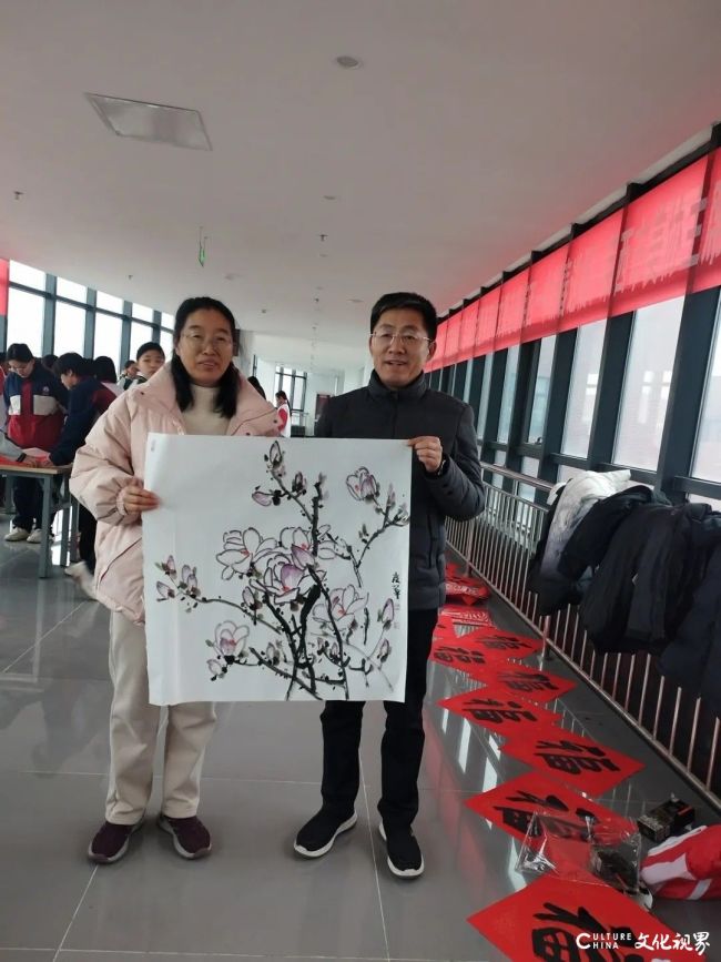 青岛莱西市2026年“文艺进校园”启动仪式暨莱西市文联走进莱西一中新春送福活动举行,莱西市美协主席周松刚向母校捐赠画作