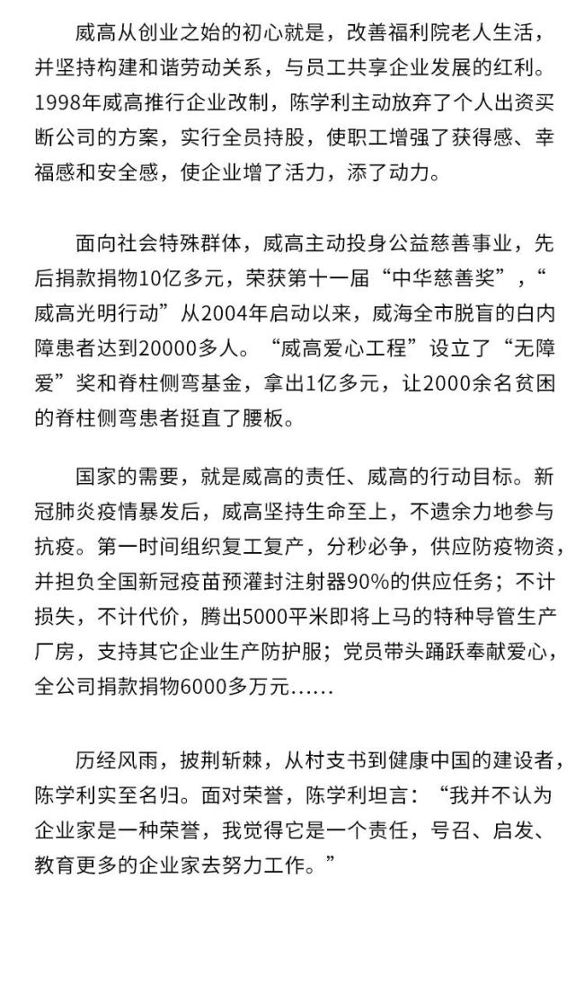 威高创始人陈学利荣膺山东省杰出企业家