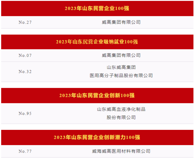 8月2日,2023年山东民营企业100强系列榜单发布会隆重召开,会上发布了2023年山东民营企业100强、创新100强、创新潜力100强、吸纳就业100强名单。其中,威高集团有限公司上榜“民营企业100强”和“吸纳就业100强”;山东威高集团医用高分子制品股份有限公司上榜“吸纳就业100强”;山东威高血液净化制品股份有限公司上榜“创新100强”;威海威高医用材料有限公司上榜“创新潜力100强”。