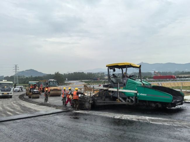 董梁高速沈海高速至新泰段四合同段K97+300-K97+667施工现场摊铺机、压路机、运输车辆有序作业,全力推进沥青摊铺与压实,呈现一派繁忙景象。秋高气爽施工忙,项目建设者们正开足马力,抢抓秋季黄金施工期,掀起大干热潮。该项目全长31.925公里,自开工以来,项目部科学组织、严控安全质量,累计完成有效合同价的58.3%。
