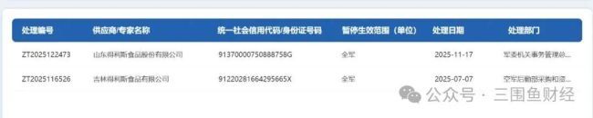 在军队采购暂停名单中,仅有的两家被处罚企业均来自得利斯。2025年7月,得利斯控股97.41%的子公司吉林得利斯就因在军用物资采购中虚假投标,被空军后勤部采购和资产管理局暂停全军采购资格。