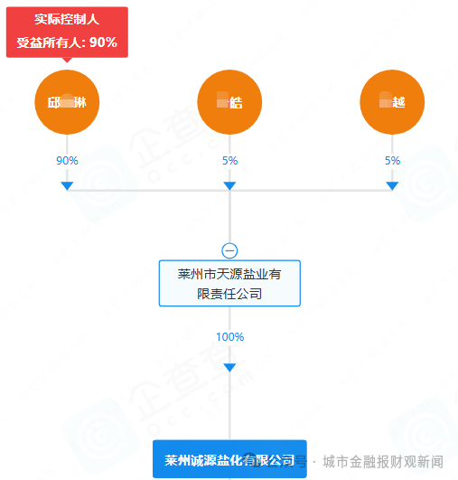 提企查查提供的信息显示,烟台诚泰的实际控制人为邱某琳,持有该公司98.35%的股份。邱某琳同时也是莱州市天源盐业有限责任公司的实际控制人,持股比例高达90%。而诚源盐化又是莱州市天源盐业有限责任公司的全资子公司,因此,诚源盐化的实际控制人也为邱某琳。由此可见,诚源盐化和烟台诚泰的实际控制人为同一人。