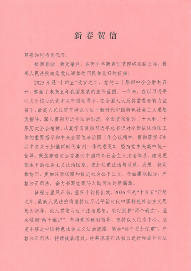 之后,双方进行了座谈。毕惠岩专委向张巧良代表送交了最高人民法院《新春贺信》,介绍了2025年度济南中院在审判执行、服务大局、队伍建设和司法改革等方面的工作情况和取得的成绩,并征求张巧良代表对法院工作的意见与建议。