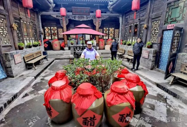 在一处醋酒坊的院门前我停住了脚步,一位推销模样的主管把我们引进院中,热情地接待我们说这是当年乔致庸家的知名醋、酒店铺,它的特点是先将上好的高粱酿成酒,再用酒糟继续发酵成醋。