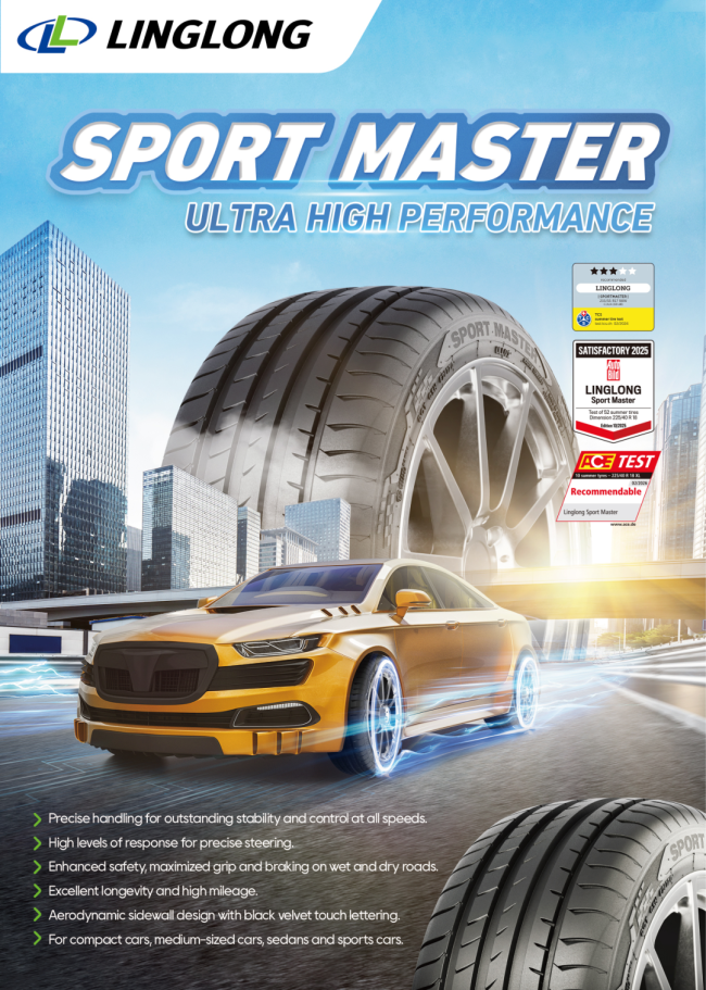 2024年,玲珑Sport Master通过ADAC、TCS及ÖAMTC三大机构联合测试,获“推荐”评级,并在《Auto Bild》52款夏季胎测试中跻身第四,被评价为“典范级均衡表现”;2025年,玲珑Sport Master再次在《Auto Bild》高性能夏季胎测试中获评“令人满意”,其湿地制动性能与一众国际大牌并列最佳。
