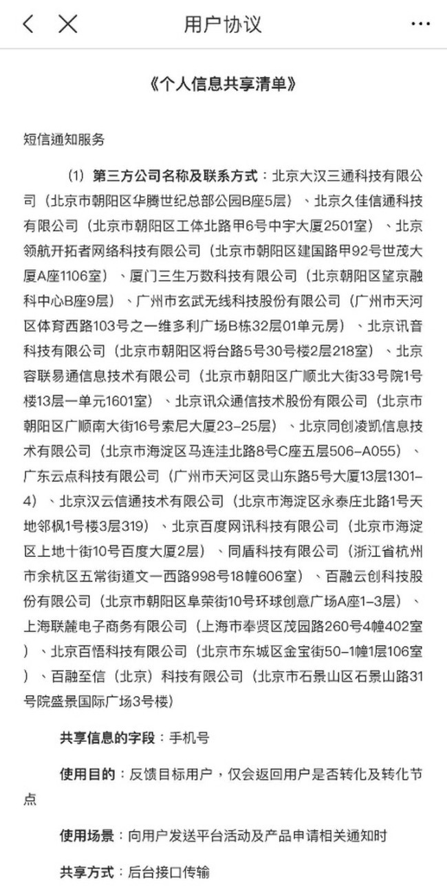记者注意到,在“融360”APP中的个人信息共享清单中,向用户提供短信通知服务的公司多达17家。
