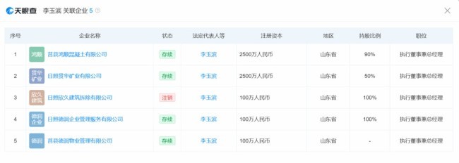 天眼查数据显示,李玉滨除担任日照贯华矿业法人代表外,还担任日照德润企业管理服务有限公司、莒县德润物业管理有限公司、莒县鸿顺混凝土有限公司3家公司的法人代表。