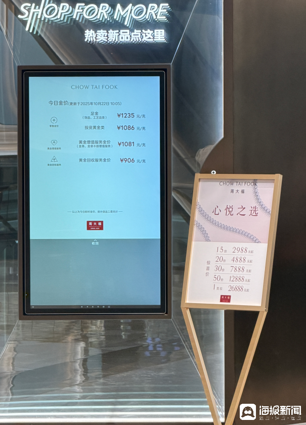 10月22日下午,记者走访济南市多家黄金首饰品牌发现,与前几日金价飙涨时相比,金饰柜台前的消费者数量较峰值时有所回落,但咨询和试戴的人流仍明显多于平日。价格公示牌上,各大品牌金价均出现显著下调:老庙黄金足金饰品报价1211元/克,较前一日大幅下跌83元/克,是当日跌幅最大的品牌。老凤祥报价1229元/克,单日跌幅达61元/克;周生生足金饰品报价1238元/克,较前一日下跌51元/克。